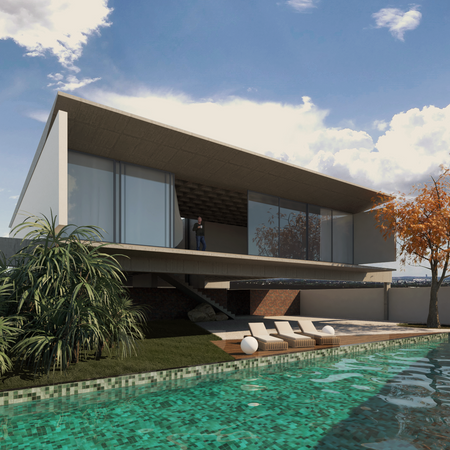 No térreo temos a área de garagem com acesso direto à rua. Dividindo o terreno ao meio temos uma parede que se eleva quase tocando o corpo da casa que funciona como anteparo visual para preservar a área de lazer e piscina que se escondem dos olhares públicos. Este elemento também ampara a escada de acesso ao pavimento superior, onde a casa se desenvolve.